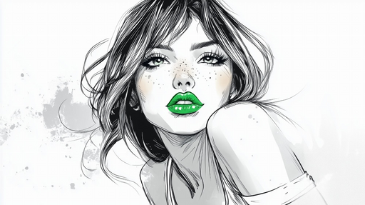 Art'loloDenna Fototapet presenterar en fängslande ritning av ett feminint ansikte, med skimrande gröna läppar som ger en djärv och modern touch. Den svartv...