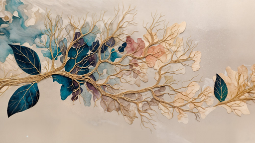 Art'loloUpptäck vår Fototapet med ett vackert mönster av gyllene grenar och akvarellfärger av löv. De blå och beige tonerna, liksom inslagen av pastellfärg...