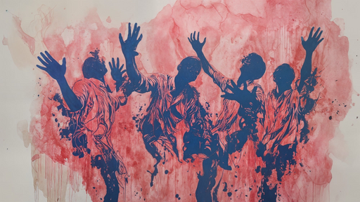 Art'loloDenna konstnärliga Fototapet visar dynamiska siluetter i blått mot en texturerad bakgrund av röda och rosa nyanser. Den kontrasterande effekten mel...