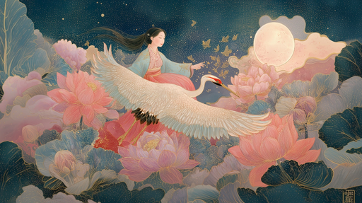 Art'loloFira skönheten i traditionell asiatisk konst med vår Fototapet som skildrar en majestätisk trana och förtrollande lotusblommor under en skimrande m...
