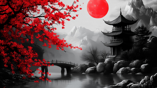 Art'loloDenna fototapet med ett asiatiskt landskap är ett djärvt och elegant val för en slående inredning. Dominerad av klara röda nyanser på en svartvit b...