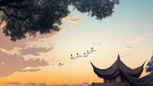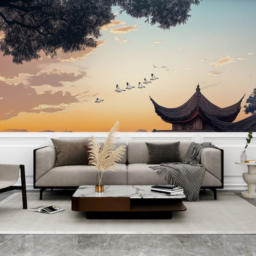 Art'loloFörvandla ditt utrymme med denna Asiatisk landskapsfototapet med en lugn solnedgång. Mjuka, lugnande orange toner ramar in silhuetter av flygande f...