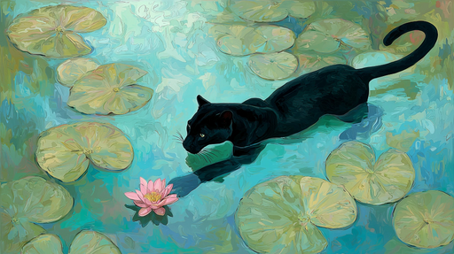 Art'loloUpptäck vår akvatiska feline fototapet med en elegant poserad svart panter mitt i vattenliljor på en lugn vattenyta. Detta fängslande mönster är pe...