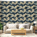 Vår tapet har ett praktfullt mönster av guld och blåa löv mot en svart bakgrund, vilket skapar en lyxig och dynamisk atmosfär i vilket rum som helst. Kombinationen av dessa djupa och rika nyanser ger en touch av elegans och sofistikering, perfekt för moderna eller samtida interiörer.
