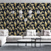 Fototapet fåglar och blommor | Gyllene fåglar på marinblå bakgrund med delikata blommor