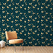 Denna tapet visar ett ömt mönster av guldfärgade löv som blommar på en mörkblå bakgrund och skapar en varm och sofistikerad atmosfär. De gyllene tonerna i löven lägger till en touch av lyx, medan den mörka bakgrunden framhäver deras förfinade detaljer.