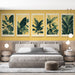 Vår fototapet har en uppsättning av grafiska illustrationer av tropiska löv på en ljusgul bakgrund, vilket skapar en livlig och modern atmosfär. Löven, i nyanser av djupgrönt, kontrasterar effektivt med det gula och ger en känsla av friskhet och vitalitet.