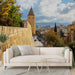 Upptäck vår fototapet antik gata, som fångar en magnifik stadsscen med en kullerstensgränd kantad av en stenmur och ett historiskt torn. Denna bild framkallar en atmosfär av charm och äkthet, perfekt för att ge djup och karaktär till ditt inre utrymme.