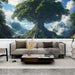 Vår tapet visar ett majestätiskt träd som växer upp från en vild landskap, omgivet av berg och frodig vegetation. Bladen i en livlig nyans av grönt skapar en slående kontrast med den ljusblå himlen och fluffiga moln, vilket framkallar en lugn och naturlig atmosfär.
