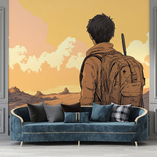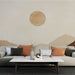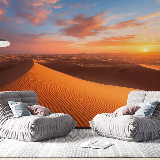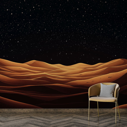 Denna tapetmålning har en minimalistisk landskap, som illustrerar stiliserade berg i nyanser av beige och terrakotta. Den mjuka solen i bakgrunden ger en varm touch och skapar en lugn och välkomnande atmosfär. De vågiga formerna av bergen ger en organisk dimension till denna enkla men ändå suggestiva design.
