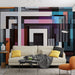 Denna fängslande tapetmålning har en komplex geometrisk design, bestående av flera överlappande lager av färger. Fyrkantiga och rektangulära former, presenterade i en rik och livlig palett, skapar en känsla av djup och rörelse som drar ögat till sig. Nyanserna av svart, vitt, rosa, blått och orange harmoniserar för att erbjuda en look som är både modern och sofistikerad.