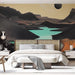 Denna fängslande tapetmålning har en surrealistisk landskap där en turkos flod slingrar sig genom vulkaniska berg, skapar en unik och lugnande atmosfär. De levande blå nyanserna kontrasterar mot de mörka formerna av bergen, medan en mystisk stjärna svävar på himlen och ger en touch av underlighet till dekoren.