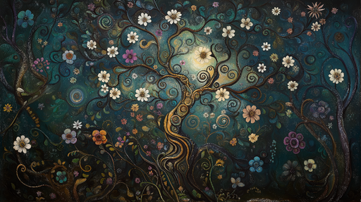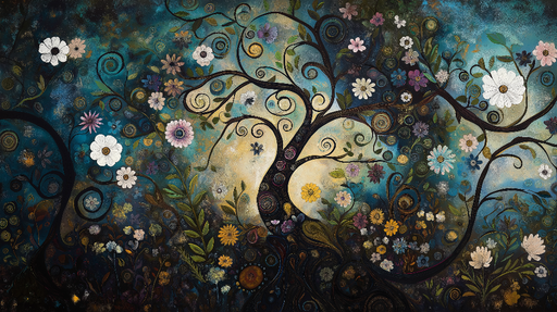 WonderMuralBu muhteşem duvar kağıdı, zengin dokulu bir arka plan üzerinde süslenmiş, stilize bir ağaç motifini ve canlı çiçekleri ve uyumlu spiralleri içeriyo...