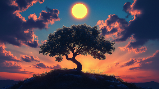 WonderMuralBu büyüleyici duvar resmi kağıdı, canlı bir günbatımı arka planına karşı görkemli bir şekilde duran bir ağaç silueti içeriyor. Turuncu, pembe ve mo...