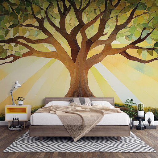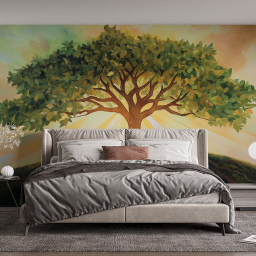 WonderMuralBu sanatsal duvar resmi kağıdı, dalları zarifçe altın ve yeşil tonlarda parlayan canlı bir gökyüzünün altında uzanan muhteşem bir ağacı vurgular. S...