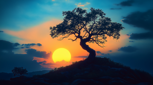 WonderMuralBu büyüleyici duvar resmi kağıdı, muhteşem bir günbatımı fonuna karşı duran muhteşem bir ağaç silüeti içeriyor. Turuncu ve altın sıcak tonları, mav...