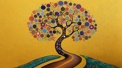 WonderMuralBu benzersiz duvar resmi, ince dalları olan, parlak altın sarısı bir arka plan üzerinde noktalı renkli daireler ile stilize edilmiş bir ağacı tasvi...