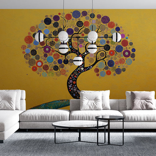 WonderMuralMajestic bir sanat ağacını tasvir eden, canlı ve renkli dairelerle süslenmiş, parlak sarı bir arka plana karşı konumlandırılan olağanüstü duvar kağ...