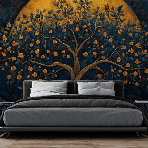 WonderMuralBu muhteşem duvar resmi kağıdı, yıldızlı yaprakları olan muhteşem bir ağaç vurguluyor, derin mavi bir arka planla kontrast oluşturan altın çiçekler...