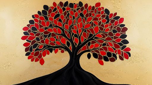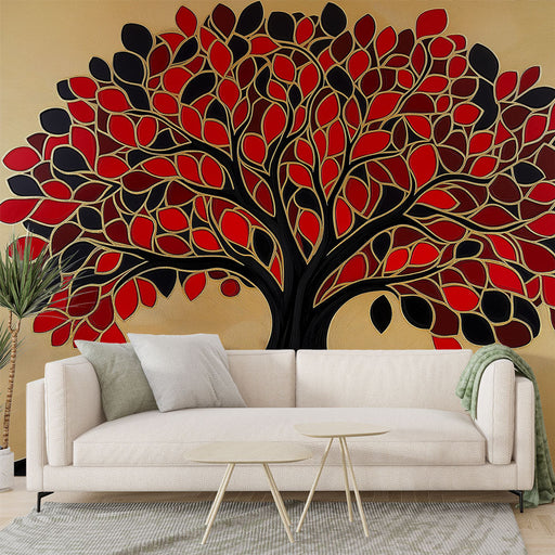 WonderMuralBu muhteşem duvar resmi kağıdı, kırmızı, siyah ve altın tonlarında yaprakları olan stilize bir ağacı, açık ve sıcak bir arka plan üzerinde içeren s...