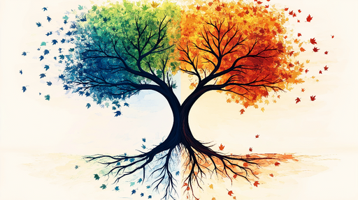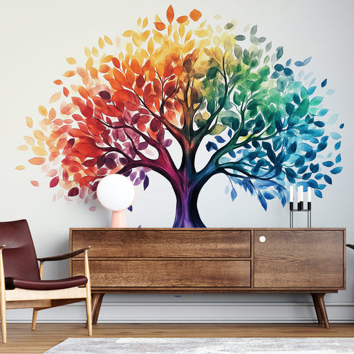 WonderMuralBu etkileyici duvar resmi kağıdı, mevsimlerin geçişlerini simgeleyen yeşil, turuncu ve kırmızı tonlar arasında bölünmüş muhteşem bir ağacın sanatsa...