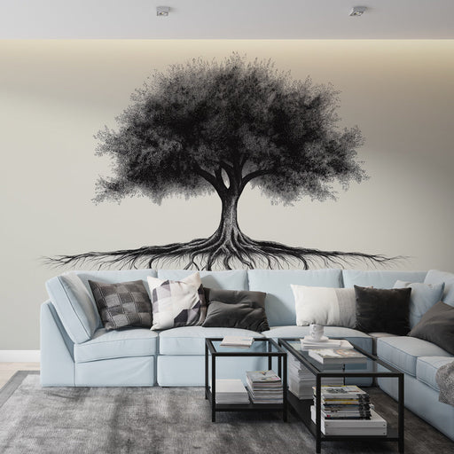 WonderMuralBu duvar resmi, narin detaylı kökleri olan muhteşem bir ağacın sanatsal bir illüstrasyonu ile öne çıkıyor. Siyah beyaz tasarım, herhangi bir iç mek...