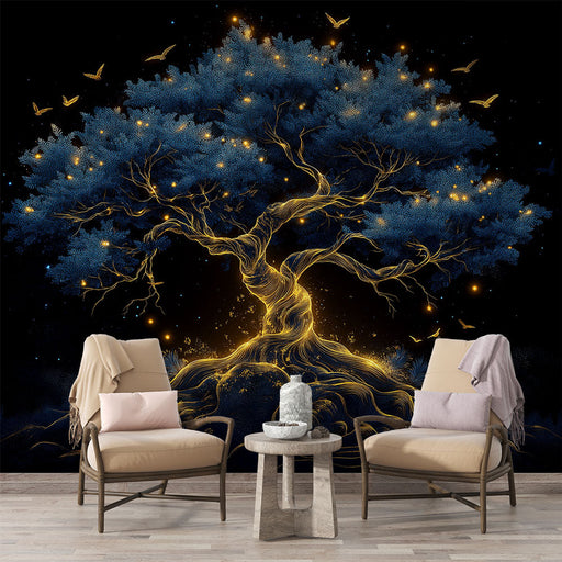 WonderMuralBu benzersiz duvar resmi kağıdı, derin mavi bir arka plana karşı narin bir şekilde parlayan altın yaprakları olan stilize edilmiş bir ağaç içeriyor...