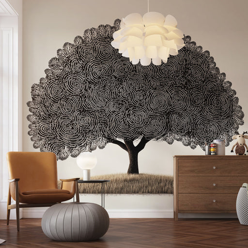 WonderMuralStilize edilmiş siyah beyaz bir ağacı içeren duvar kağıdımızı keşfedin, muhteşem bir daire içinde çevrili. Bu şık tasarım, dalların ve yaprakların ...
