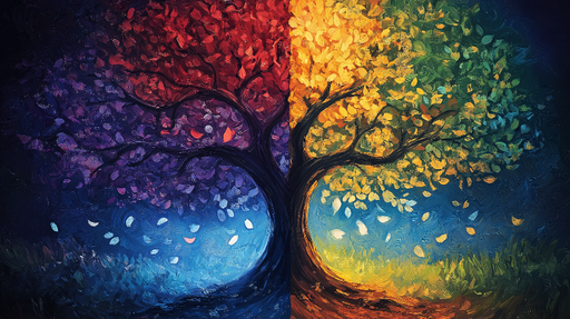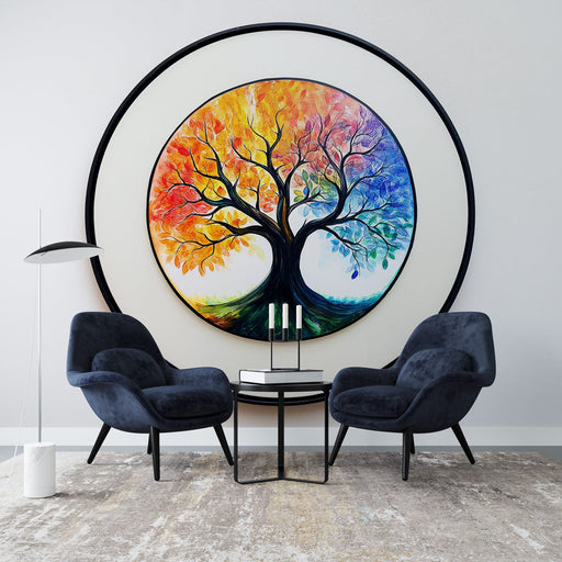 WonderMuralBu büyüleyici duvar resmi, mevsim ağacını temsil eden iki renkli yarıya bölünmüş, yaz ve kışı temsil eden renkli yarıları olan bir ağaç içerir. Sol...
