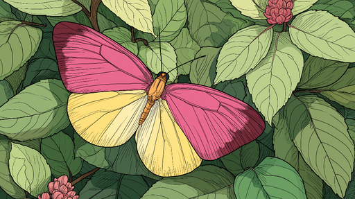 WonderMuralÖzel duvar resmimiz, pembe ve sarı kanatlı bir kelebeğin zarifçe dinlendiği, yemyeşil yapraklar arasında bir zeminde sergilenmektedir. Çeşitli yapr...