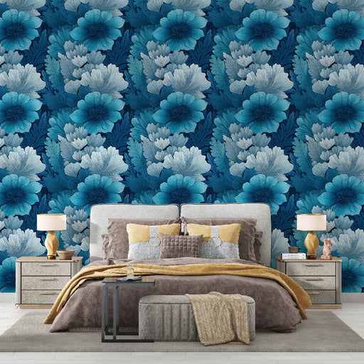 WonderMuralBu duvar resmi kağıdı, mavi tonlarında muhteşem bir çiçek ve yaprak deseni sunar, sakin ve zarif bir atmosfer yaratır. İnce işlenmiş grafik detayla...