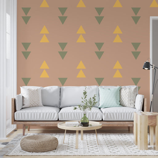 Studio SamaBu geometrik duvar kağıdı, kum, sarı ve yeşil tonlarda üçgen desenini içerir ve iç mekanınıza modern ve huzurlu bir dokunuş getirir. Oturma odası v...