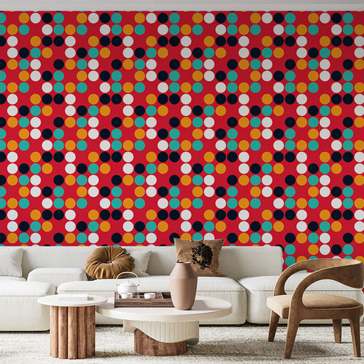 Studio Samaİç mekanınıza dinamik bir dokunuş ekleyin renkli nokta desenli duvar kağıdı ile. Canlı kırmızı bir zemin üzerinde geometrik desen, siyah, beyaz, tu...