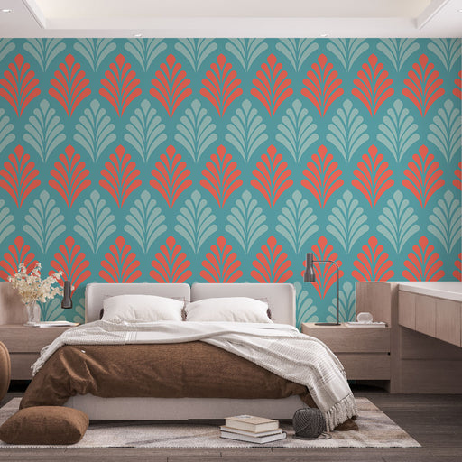 WonderMuralBu bej duvar kağıdı, stilize yaprakların kırmızı ve mavi tonlarındaki etkileyici deseniyle dikkat çekiyor, modern ve sıcak bir ambiyans yaratıyor....