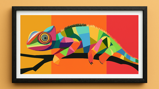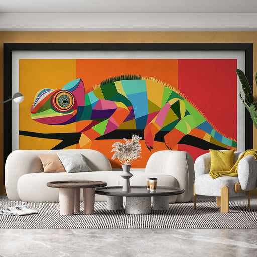 WonderMuralBu duvar resmi kaşmir, canlı renkler ve geometrik şekillerle stilize edilmiş bir bukalemun içeriyor, iç mekanınıza oyuncu ve modern bir dokunuş get...