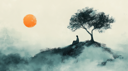 WonderMuralBu Fotoğraf Duvar Kağıdı, geniş bir ağacın ve yalnız bir figürün canlı bir güneşi gözlemlediği nazik bir gökyüzü altındaki sakin bir evrene sizi ta...