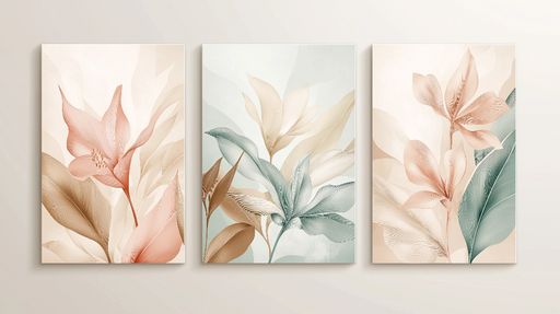 WonderMuralBu duvar resmi, pastel tonlarda zarif çiçekler içeren bir seti içerir ve sakin ve rafine bir atmosfer oluşturur. Pembe, bej ve yeşil tonlarını birl...