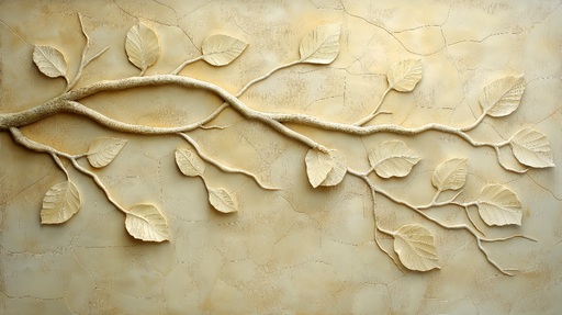 Tüm ayrıntıları görüntüleFototapet taklit boyama | Bej zemin üzerinde ince dallar ve kabartmalı yapraklar