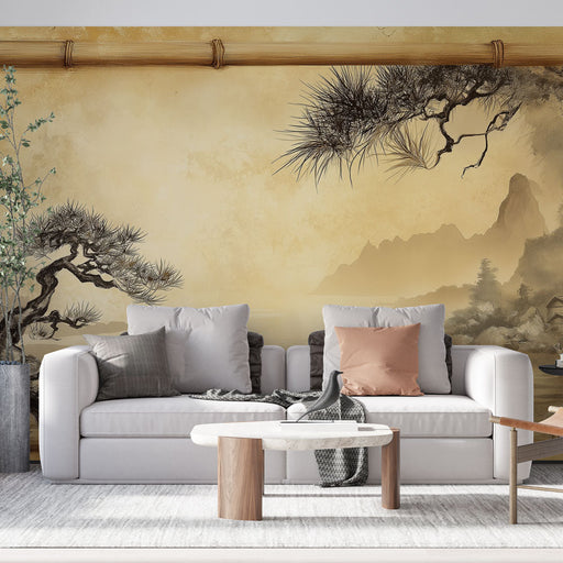 WonderMuralBu duvar kağıdı, Asya sanatının doğayla buluştuğu huzur verici bir manzara çağrıştırıyor, uzak dağların narin bir şekilde tasvir edildiği, sakin bi...