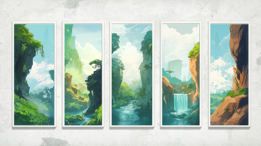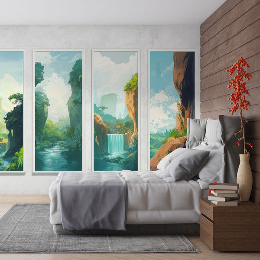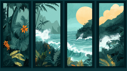 WonderMuralBu duvar resmi, berrak bir gökyüzü altında ince kumlu plajları ve görkemli dağları içeren tropikal manzaralardan ilham alan bir dizi resmi içeriyor...