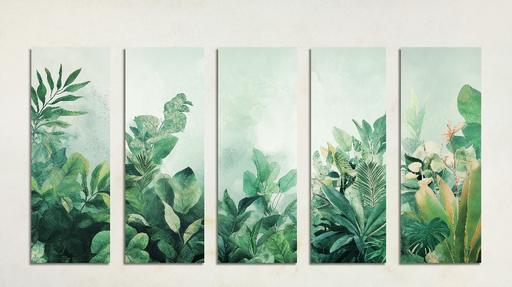 WonderMuralBu duvar resmi kaçınılmaz tropikal yaprak deseniyle zengin bir ormanı çağrıştırır, çarpıcı yeşil tonlarda. Her panel, çeşitli şekillerde yaprakları...