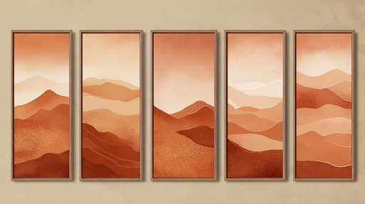 WonderMuralBu duvar resmi, yumuşak ve uyumlu şekillerle soyut bir manzara çağrıştırır, burada kırmızı, turuncu ve bej sıcak tonları, sıcak ve davetkar bir atm...