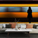 Bu etkileyici duvar resmi, tren bekleyen bir kişinin gizemli siluetini canlandırırken, canlı renk bulanıklarıyla çevrili, şehir yaşamının dinamizmini ve enerjisini çağrıştırıyor. Turuncu ve mavi tonlar gözü yakalayan ve mekana enerji katan çarpıcı bir kontrast oluşturuyor.