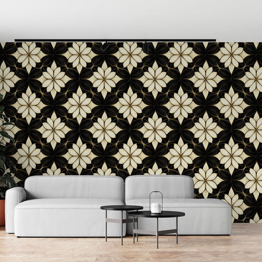 WonderMuralBu duvar kağıdı, zarif siyah çiçeklerle eşleştirilmiş altın yapraklarla göz alıcı bir çiçek desenini sergiliyor, hem şık hem de modern bir atmosfer...