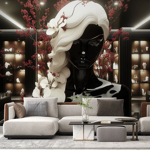 Art'loloBu modern heykel duvar kağıdı, zarif beyaz ve kırmızı çiçeklerle süslenmiş parlak siyah bir silueti içerir. Modern bir oturma odası için idealdir, ...
