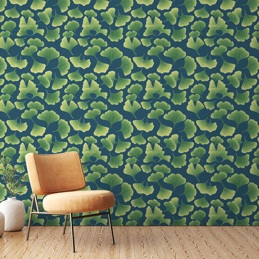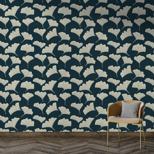 WonderMuralBu duvar kağıdı, herhangi bir odaya zarafet dokunuşu ekleyen derin mavi bir zemin üzerinde zarif bir tasarıma sahip olan bir ginkgo yaprağı motifi ...