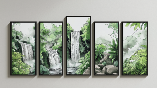 WonderMuralBu duvar resmi, yeşilliklerle çevrili muhteşem bir şelaleyi tasvir ediyor. Yemyeşil yaprakların incelikli detayları ve su yansımaları huzurlu ve ca...