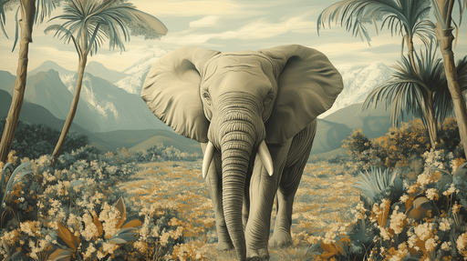 WonderMuralBu duvar resmi, canlı bir tropikal manzarada, güç ve bilgeliği simgeleyen muhteşem bir fili göstermektedir. Palmiye ağaçları ve narin çiçeklerle çe...
