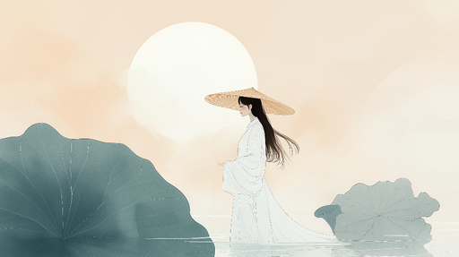 WonderMuralBu duvar resmi kağıdı, büyük lotus yapraklarıyla çevrili bir gölette beyaz bir elbise giymiş bir kadının zarifçe yürüdüğü huzur verici bir sahne su...