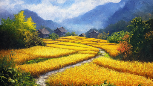 Tüm ayrıntıları görüntüleFototapet altın pirinç tarlaları | Alevlenen pirinç tarlalarıyla pastoral manzara